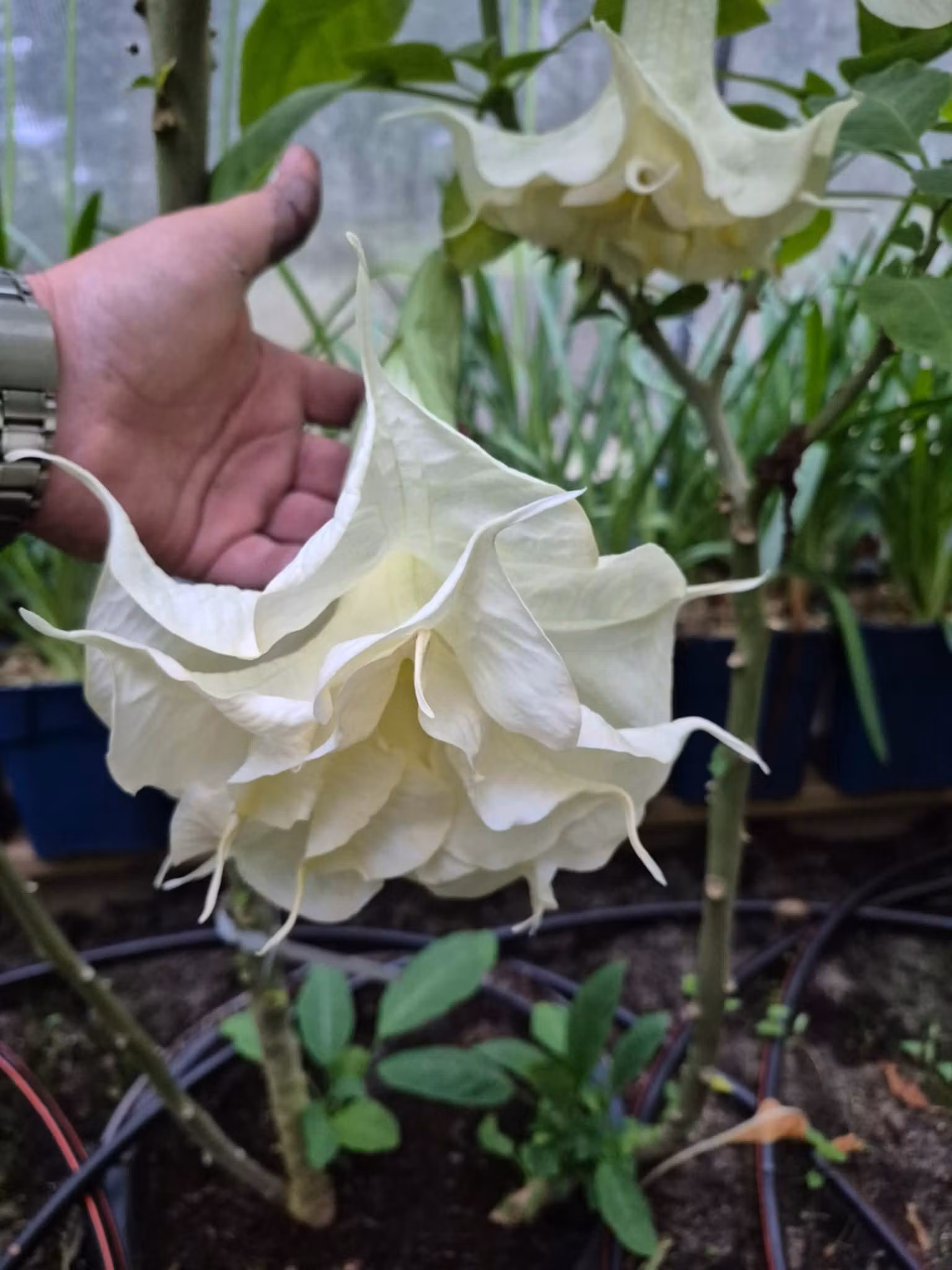Brugmansia Angels Proud är en exklusiv och mycket eftertraktad sort som imponerar med sina stora, fyllda, vita blommor – ofta med lätt krusade kanter som ger ett extra elegant intryck. Blommorna hänger som lyxiga trumpeter och sprider en söt, mild doft som förhöjer kvällsstämningen i trädgården eller på uteplatsen.