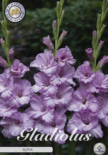 Alpha är en elegant gladiolus med stora, lavendel vita blommor som öppnar sig i en rak och ståtlig blomspira.