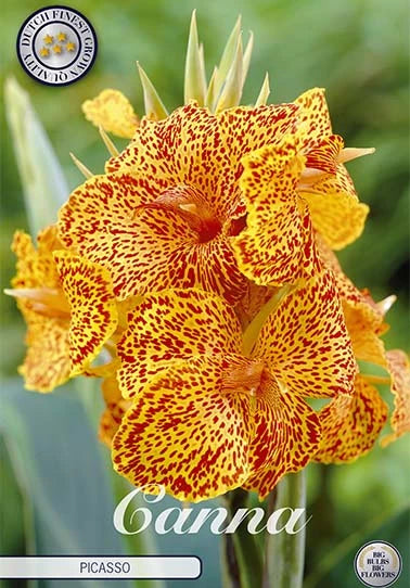 Canna Picasso är en färgexplosion med gulprickiga blommor som är vackert stänkta med varm rödorange ton.