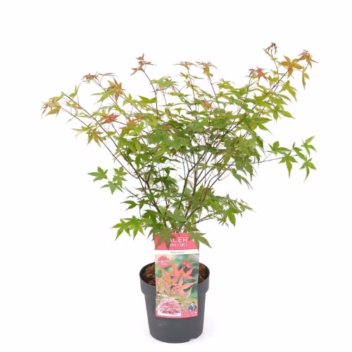 Acer palmatum 'Beni-Maiko' är en elegant japansk lönn som fascinerar med sina flikiga, rödaktiga blad. Denna lönn har en kompakt, upprätt form, vilket gör den perfekt för mindre trädgårdar eller som en vacker prydnad i kruka på terrassen eller balkongen. Bladen får en intensiv röd färg på våren och sommaren, och de får en varmare, orange-rödnyans under hösten, vilket skapar en fantastisk höstshow.