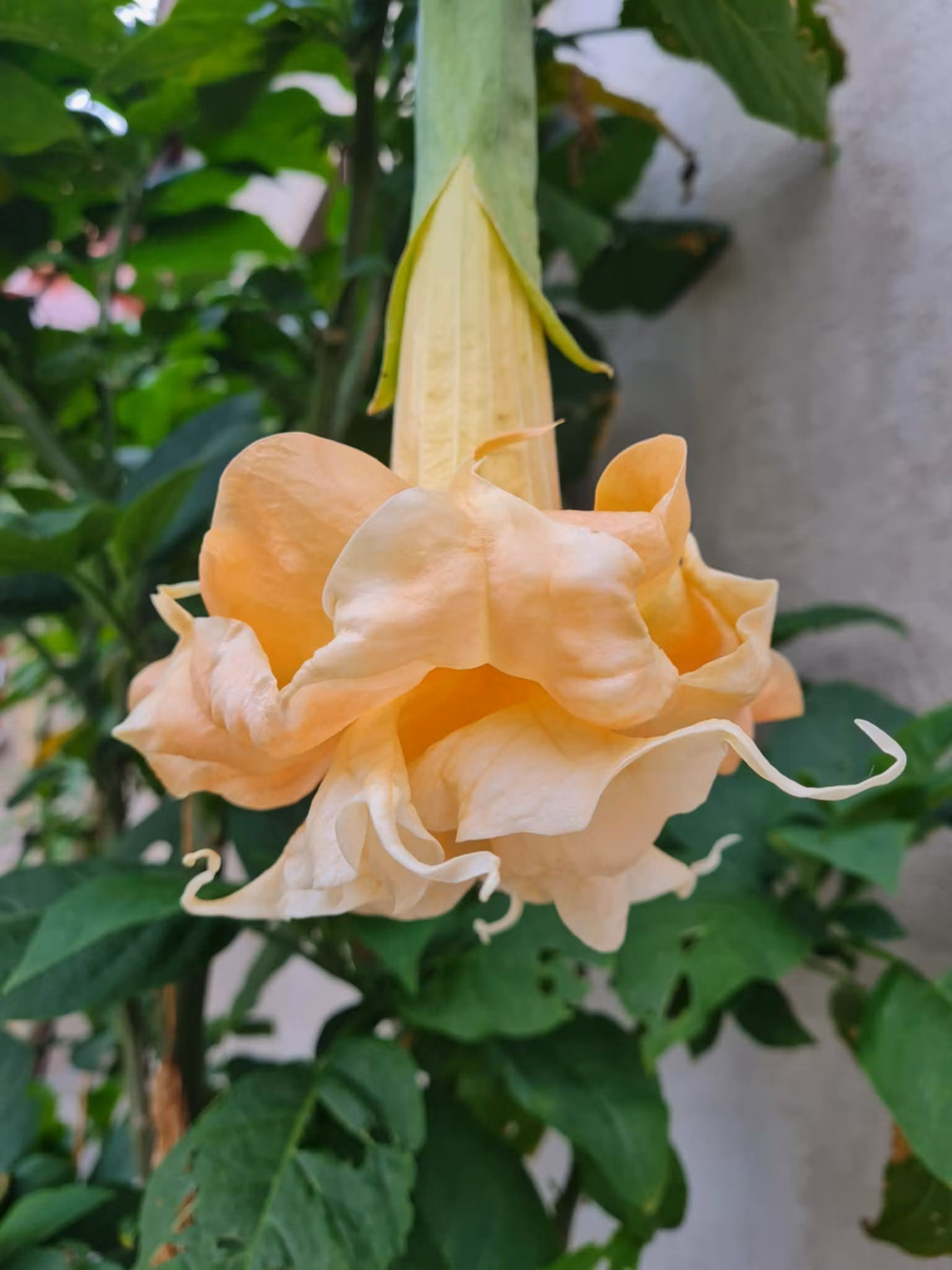 • Blommor: Stora, hängande och trumpetformade i aprikos till laxrosa toner.