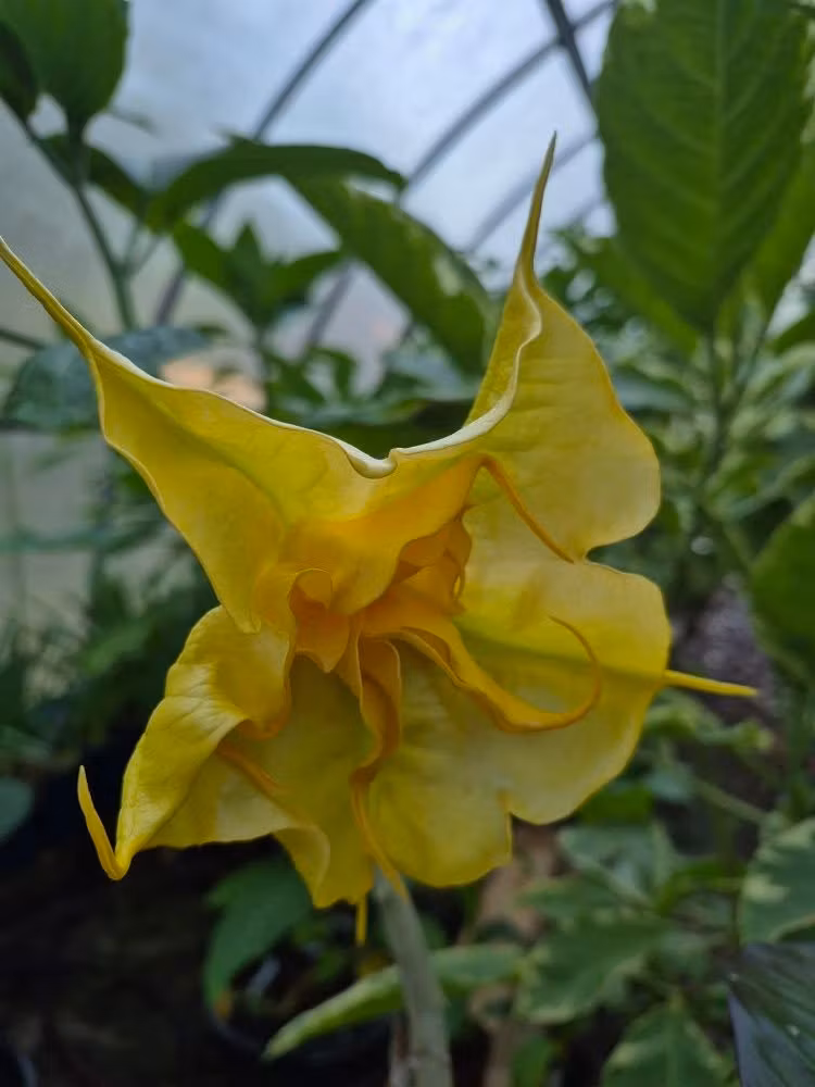 • Blommor: Stora, hängande och trumpetformade i klar, gyllengul ton.