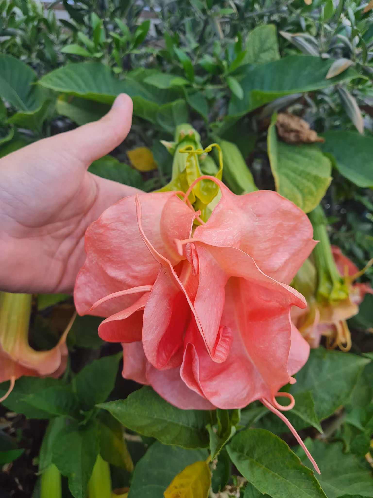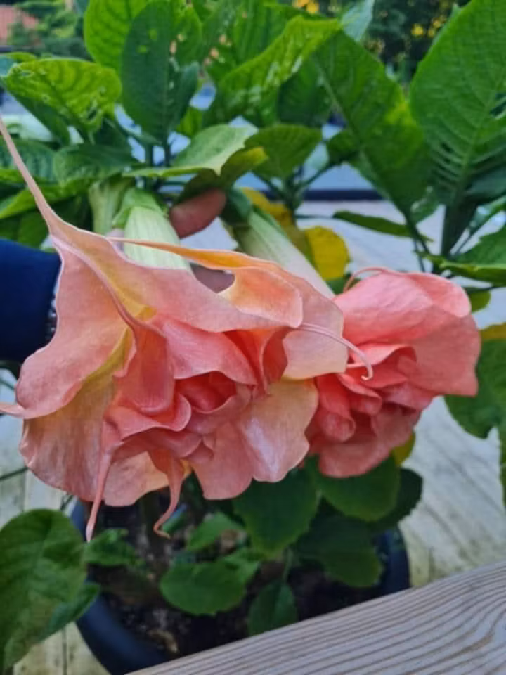 • Blommor: Stora, hängande trumpeter i ljusrosa/aprikos/crème