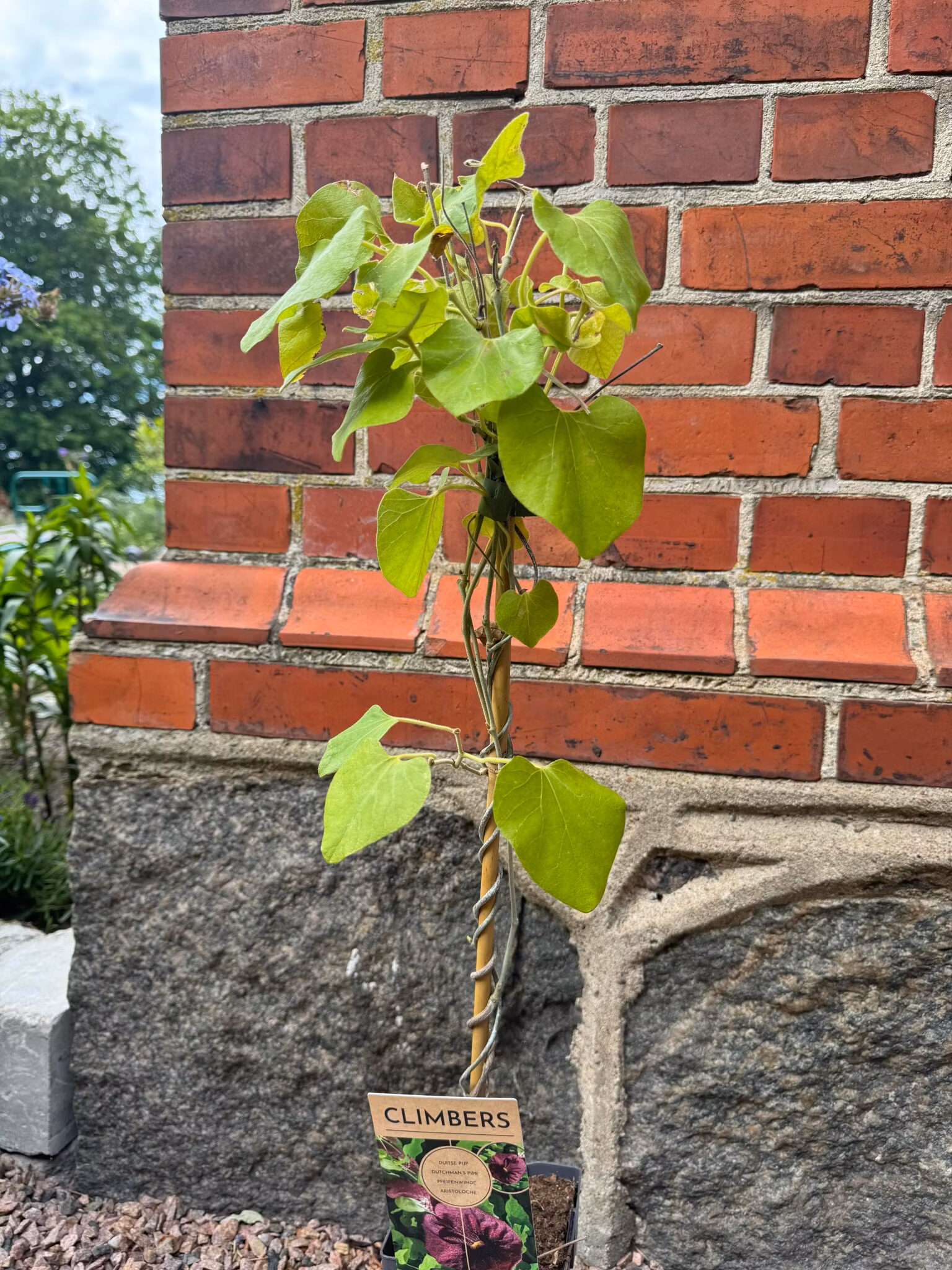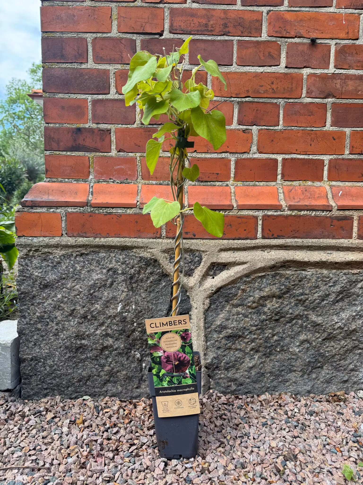 Beskrivning:Aristolochia macrophylla, även känd som storbladig pipranka eller holländsk pipranka, är en lövfällande klätterväxt som tillhör familjen Aristolochiaceae. Denna växt är särskilt känd för sina stora, hjärtformade blad och sina unika, pipformade blommor. Bladen kan bli upp till 30 cm långa, och blommorna, som vanligtvis är gröna till bruna med ett inre mönster, är utformade för att locka pollinerande insekter.