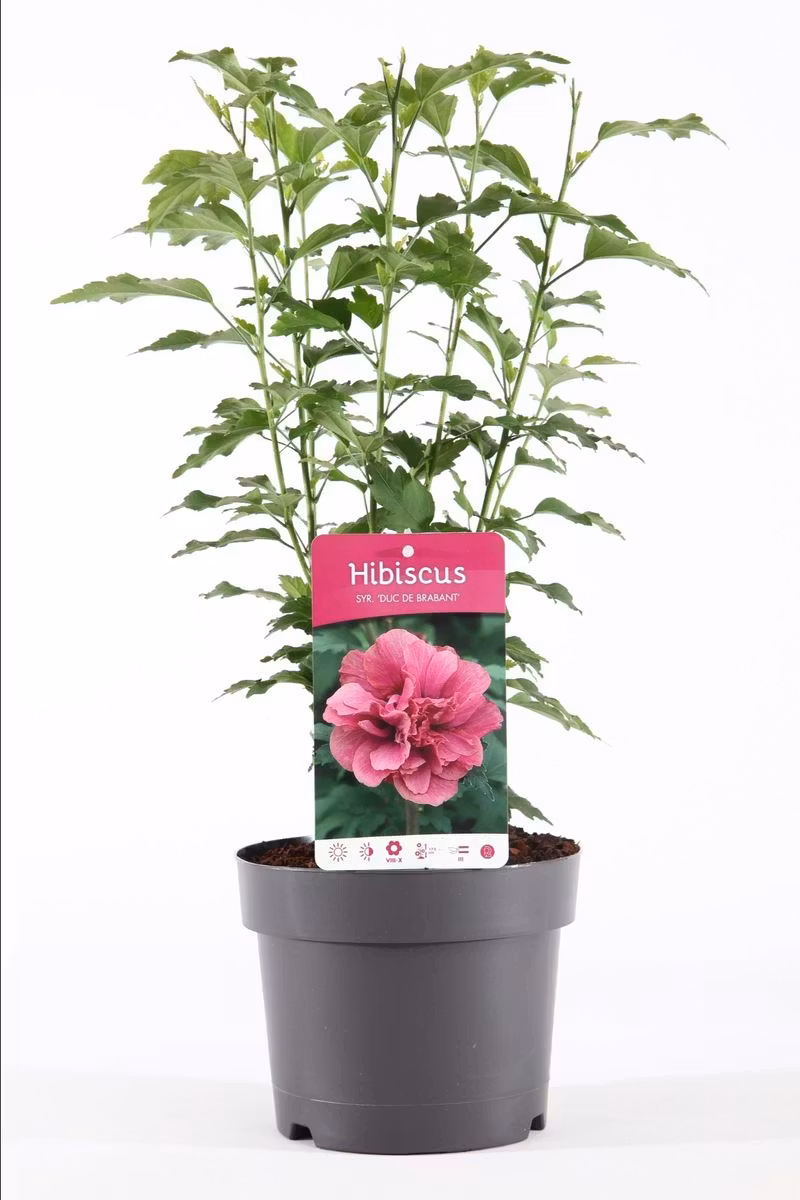 Blommorna på 'Duc De Brabant' är stora och trumpetformade, vilket gör dem till ett riktigt blickfång. Denna frilandshibiskus trivs i både soliga lägen och skyddade hörn och passar perfekt som solitär, häckväxt eller i rabatter. Dessutom är den härdig och tålig, vilket gör den lättskött och perfekt för både nybörjare och erfarna trädgårdsmästare.
