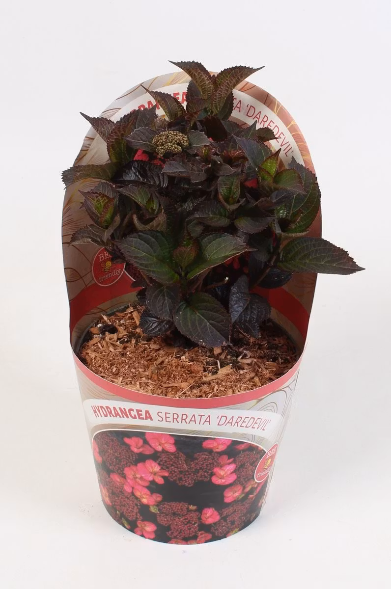 Hydrangea serrata 'Daredevil' är en unika och iögonfallande purpurhortensia som kombinerar mörkt purpurfärgade blad med lysande blommor i olika nyanser av rosa till blått, beroende på jordens pH-värde. Dess kompakta och eleganta växtsätt gör den till ett perfekt val för rabatter, krukor och som kantväxt i trädgården.