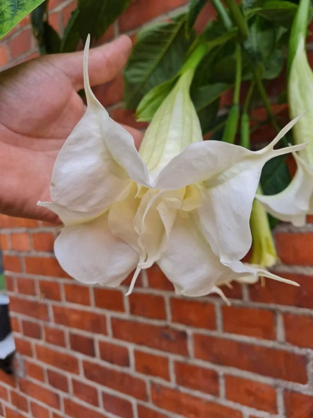• Blommor: Stora, hängande och trumpetformade i intensiv vit färg.